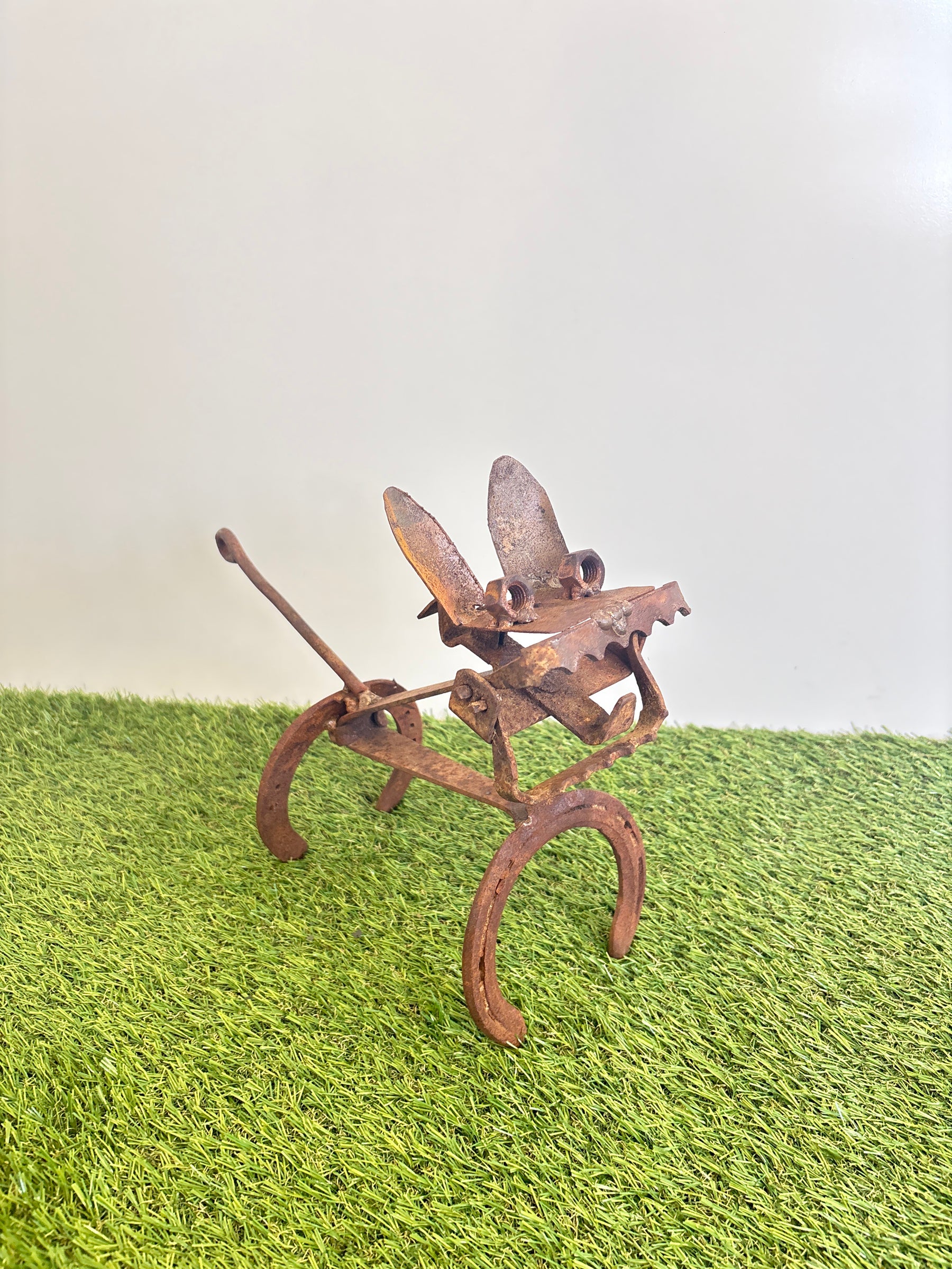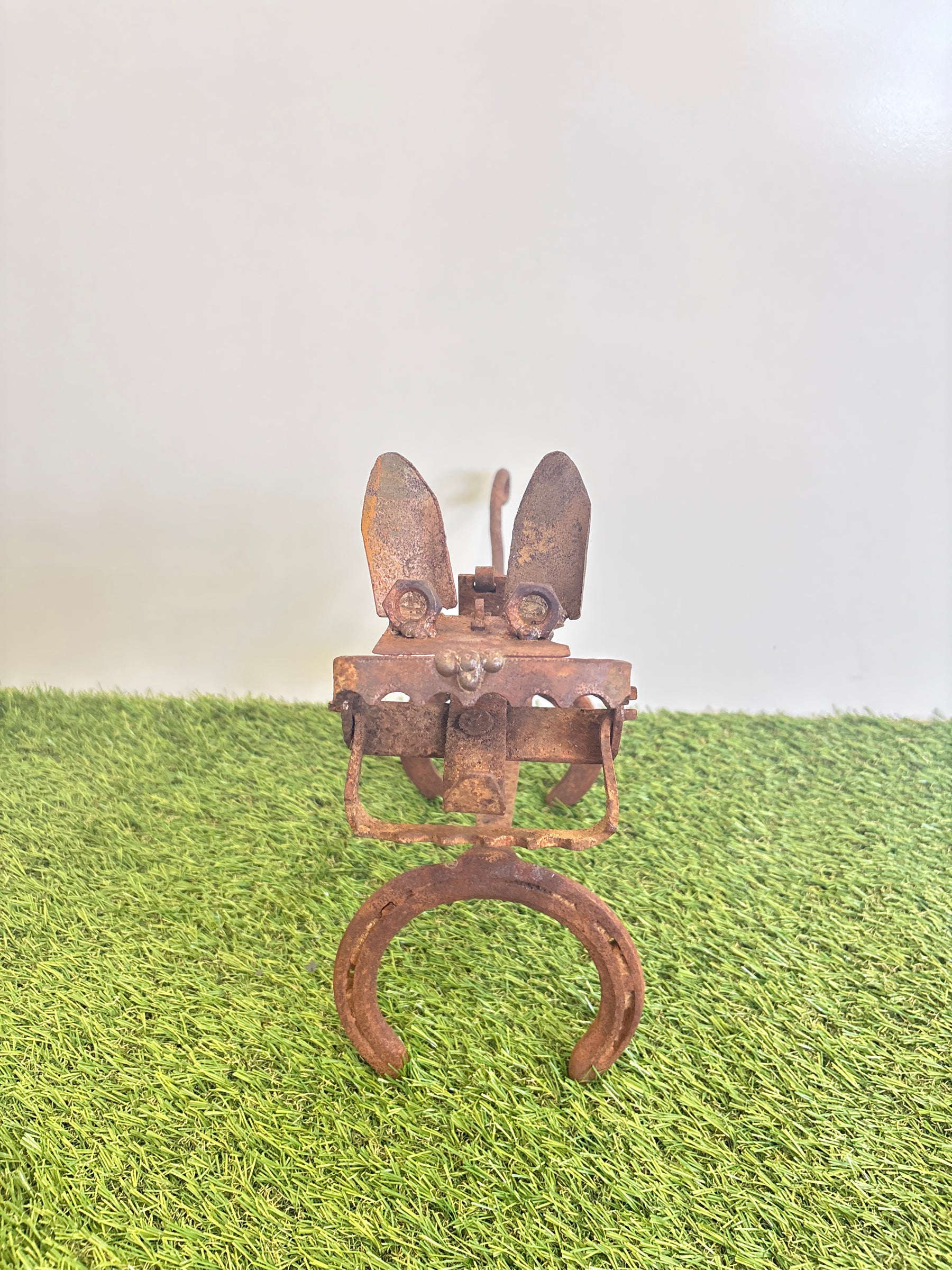 Unleash creativity with this Trap Dog Metal Sculpture, a one-of-a-kind piece crafted from an old rabbit trap and two repurposed horseshoes. This handmade upcycled metal dog blends rustic charm with industrial artistry, making it a perfect garden, home, or office décor piece for dog lovers and collectors alike.