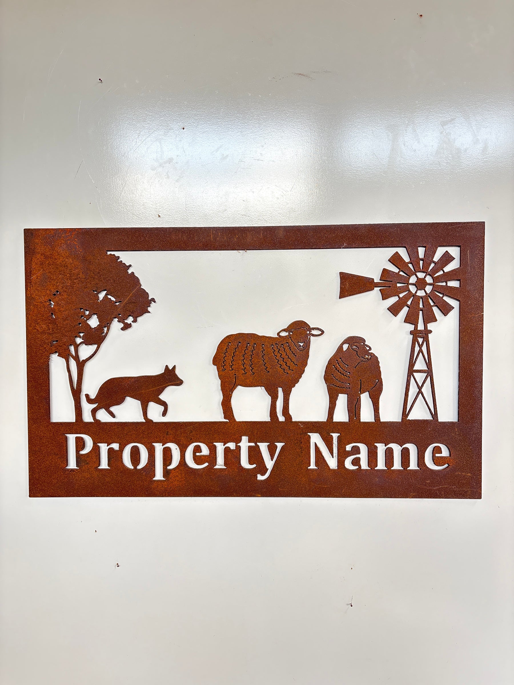 This custom-made metal property sign features a classic, rustic design depicting a sheep and dog. This eye-catching sign will suit any outdoor space or farm. Made from robust metal, it is built to last in all kinds of weather.